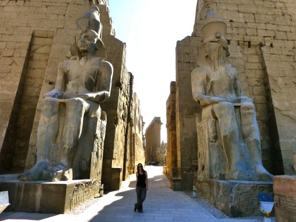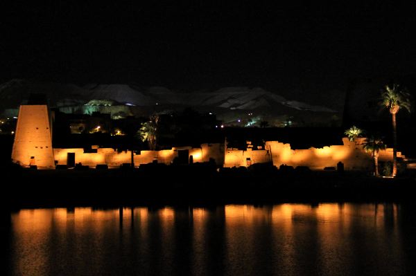 Nach den Pyramiden von Giseh ist Karnak die bedeutendste archäologische Stätte Ägyptens. Um die 1300 Jahre und mehrere Herrscher waren nötig, um diese überwältigende Anlage zu erschaffen. Vollgepackt bis obenhin mit Kapellen, Pylonen und Obelisken. Wir folgen der dröhnenden Stimme aus dem Off und werden Schritt für Schritt mit Background-Musik durch den Tempelhof geleitet, wandern an einem riesigen quadratischen See vorbei und nehmen Platz auf einer Arena. „This is the holy lake!“, nur Priestern wurde es gewährt, hier zu baden, um rein für die Götterverehrung zu sein. An die Tempelmauern werden bunte Lichter gebeamt, das frühere Leben des Ramses, Tutanchamuns und Ptolemäus vertont. Der dunkle See spiegelt die bunten Spots zitternd wieder, die kupferfarbenen Tempelwände erwachen zum Leben, über uns der glimmernde Mond und die Millionen Sterne. Liz! Raus da!