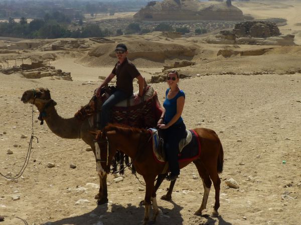 Mr. Cheops war dabei ein rechter Korintenkacker, doch deshalb weicht die grandiose Grabstätte auf einer Seitenlängen-Strecke von 230 Metern auch nur vier kleine Zentimeterchen voneinander ab. Mit schlabberigem Lchchlchch kommt Ali Baba nun zum Stehen und auf Kommando von Hassan, unserem heutigen Guide lässt er sich laut ächzend auf die knochigen Knie fallen, wir steigen ab, laufen ein bisschen auf den kleineren Pyramiden herum, stehen Fotomodell mit Kamel, lassen Georg entscheiden, wohin er als nächstes reiten will („Ask your husband – HE will decide!“, ja ja schon gut!) und traben dann im Shake-Verfahren zur größten Sphinx der Weltgeschichte. Sie ist mit knappen 4000 Jahren zugleich das älteste figürliche Monument Ägyptens und ragt 20 Meter in die Höhe, bei einer Seitenlänge von 74 Metern. Aus einem einzigen Stein wurde die mythische Figur mit dem machtvollen Löwenkörper und Pharao Cheops Gesicht gehauen. Ja, wieder die schwitzenden Sklaven, die dann sterben mussten.