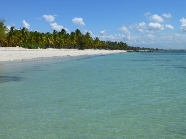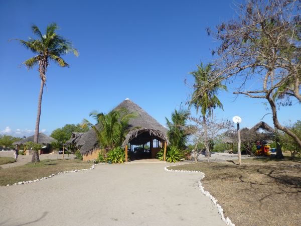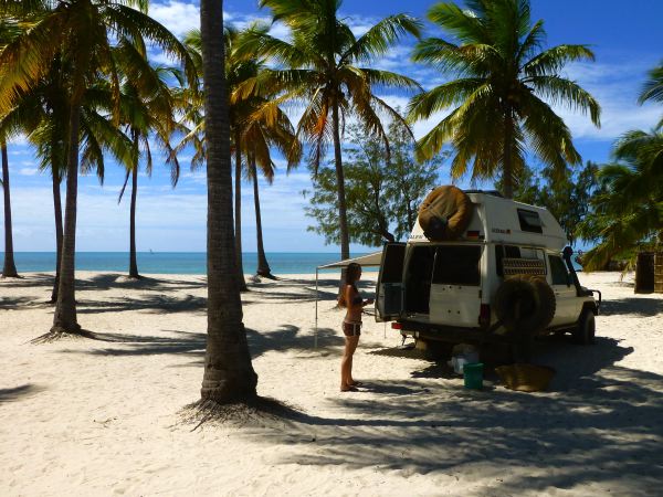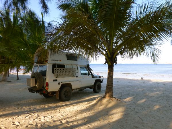 Während ich mir noch den Schlaf aus den Augen reibe, wandeln blaue Schüsseln, gelbe Plastikkanister und geflochtene Basttaschen auf anmutigen Köpfen vorbei, quirlige Kinder buddeln im Sand nach essbaren Muscheln und ein paar bunt-betuchte Frauen waten mit weissen Eimern weiter draussen im kristallklaren Meer herum. Ein dunkler Mensch mit rot-weisser Bademütze auf dem Kopf erscheint plötzlich lautlos von hinten aus dem Nichts und stellt sich als José vor. Die an diesem Ort schon wieder kultige Stoffmütze mit dem breiten weissen Mittelstreifen erinnert mich an Schulzeiten! Wie oft musste ich so eine kaufen, weil ich die eigene zu Hause vergessen hatte. Jedenfalls nennt José den hiesigen Camp-Eigentümer Hashim seinen Boss und ist ab sofort für unser Wohl und die Sicherheit hier zuständig, erklärt er mir mit Hand und Fuss und Portugiesisch, während die Kappe lustig von weiss auf rot dreht.