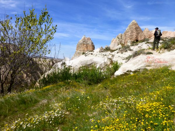 Wir lernen Ömers Frau, Dschingis Mama und sein Baby, des Onkels Tochter, die zweite und die erste Frau, die Söhne, die Schwiegertöchter, sowie den Rest der Familie kennen. Und den VW-Bus. Und den Marktstand. Und den Dilek-Döner. Wir fahren in Onkels Opel und in Shahins Mercedes. Streicheln Onkels Hund Paul und Shahins Schäfchen, halten Ömers Entchen. Wir dürfen nicht für die Shais bezahlen („Nein! Nein! Iste doch eine Gastefreude! Trinkste du e schön! Prost!“), auch nicht für die Cafes („ja, eigentlich musste schon bezahle, aber nichte du, biste du deine Geburstaggewoch hier!“), und schon gar nicht für die Früchte zwischendrin („iste von die meine Frau!“). Wenigstens zwei Flaschen Wein lässt er uns kaufen.Jeder Tag ist vollgepackt: Ausflüge ins Love Valley mit seinen Phalli-Symbolen, ein Besuch des Open Air Museums und seinen eingegrabenen Kirchen (die Jahrhunderte überdauert haben), Fahrradtouren durch die Mondlandschaft, fünf Stunden-Wanderungen bei strahlendstem Sonnenschein und natürlich unendlich viele Döner-Kebabs (5 Türkische Lira/2,50 Euro) in der märchenhaft beleuchteten Nacht Göremes.