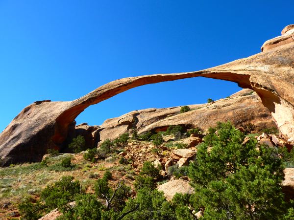 Klingt romantisch, war´s aber nicht. Erst hinter einer Sandsteinmauer versteckt, steht er plötzlich vor uns, hinter sich die schneebedeckten Gipfel der Manti La Sal Mountains. So weit, so romantisch.