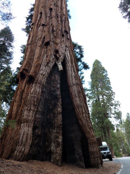 Über gelbe Acker, grünes Weideland und neblige Berge wie im tiefsten Dschungel des Amazonas schlängeln wir uns die enge Straße zum Sequoia Nationalpark hoch. Im Rückspiegel die Schwestern im Chateau, bei denen wohl ein Kronleuchter und das Silberbesteck zu schwer sind, denn das RV schnauft ganz schön schwer in diese Höhe hinauf. Ein fabelhafter Ausblick über bewaldete Gipfel erwartet uns oben - endlich mal wieder sattes Grün, dichte Wälder, Bäume soweit das Auge reicht, steinige Schluchten, schneebedeckte Gipfel in der Ferne. Wir fahren vorbei an Joshua-Trees (Yucca-Palmen-Bäume) und Maronen, die in birnenartiger Form noch unreif gelb an kleinen Ästen hängen. Die Farbskala reicht von sandgelb über blutrot, kastanienbraun hin zu moosgrün, über uns der azurblaue Himmel mit weißen Quellwölkchen. Am „Lodgepole“, nahe des Visitor Centers campen wir und bekommen einen ersten Eindruck von den riesigen Sequoia-Bäumen. Für heute wollen wir uns noch ein wenig lockern und walken den kurzen Trail zu den „Tokopah“-Wasserfällen hinauf. Tags darauf kommen wir aus dem Staunen nicht mehr heraus: zuerst läuft uns eine Bärenfamilie über den Weg, danach begutachten wir den „General Sherman Tree“, das größte Lebewesen der Welt! Dieser sagenhafte, groß, größer, am größten-Baum ist über 2200 Jahre alt, und um jetzt ausnahmsweise mit Fakten um sich zu werfen: ist 36 Meter breit und 110 Meter hoch. Ein gigantischer Stamm, aus dem Äste in Dimensionen wachsen, die jede deutsche Eiche vor Neid erblassen lassen. Darunter, daneben, drumherum fühlt man sich so winzig, so mini, so klein. Staunend wandern wir durch den „Giant Forest“, und nacheinander bäumen sich Riesen auf, einer neben dem Anderen, ein Maximum an Bäumen, alle Superlative reichen nicht aus, sie zu beschreiben. Wie Ameisen erscheinen die Menschlein, die darunter stehen, man kann es kaum fassen. Nicht mal mein Extra-Weitwinkel der Kamera kann ihn einfangen, diesen wuchtigen Sequoia - keine Chance. Ich drehe und bücke mich und dann fällt´s Sabine ein: mit der der „Panorama“-Funktion könnte es klappen! Jetzt haben wir ihn drauf! Wie Zwerge im Riesenland watscheln wir herum, bekommen große Augen, drehen uns die Köpfe aus, im Versuch, die Baumkrone zu sehen! Meine geliebten Eichhörnchen tänzeln wie verrückt am Baum auf und ab, kein Wunder, die haben endlich kein Ein-Zimmer-Appartement mehr, sondern ein ansprechendes Loft als Residenz gefunden! Die „Hauswand“, die Rinde des durchschnittlichen Sequoias ist ja schon 70 Zentimeter dick! Ein herrschaftlicher Palast mit Sicherheitswänden!Auch den „King´s Canyon“ besichtigen wir, bestaunen weitere massive Mega-Bäume im „Giant Grove“ bevor wir uns auf den Weg zum „Yosemite Nationalpark“ machen...