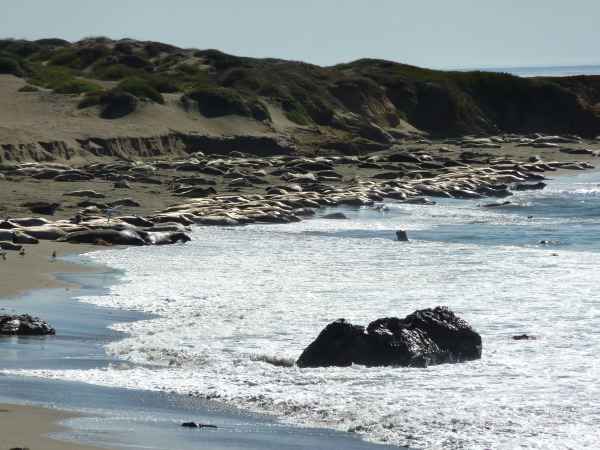 In Monterey sitzen wir zufrieden am Strand, beobachten die planschenden Robben, segelnden Möwen, quirligen Eichhörnchen und tuckernden Boote, laufen hin zum „Monarch Habitat“ und stehen fasziniert vor Trauben von Schmetterlingen. Es sind die Monarchen, bernsteinfarbene Falter mit schwarzer Maserung, die hier überwintern. Hier verharren wir ein Weilchen, anschließend ist Wäschewaschen in der Coin-Laundry angesagt und Weiterfahrt nach Carmel, ein hübscher Küstenort mit malerischen Villen und wunderschönem weißem Strand.Wir nächtigen am State Park „Botcher´s Gap“, hoch in den bergigen Wäldern ($12), schauen noch am Wasserfall des „Julia Pfeiffer Burns State Park“ vorbei, um kurz vor San Simeon ein Heer von Seelöwen zu beobachten, die zu hunderten faul im Sand liegen, sich wälzen, eingraben und miteinander balgen. Die Teenies unter ihnen rivalisieren, messen ihre Kräfte, die Größeren, Männchen bis zu 2,5 Tonnen schwer, grölen, kämpfen und stoßen seltsame Laute aus, die an verstopfte Abflußrohre erinnern.