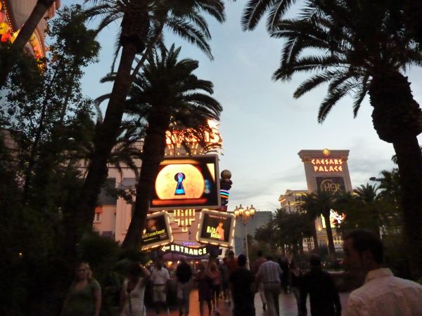 Und der Spaß geht weiter! Avatar war die beste Vorbereitung auf die bunte, blinkend aufregende Spielerstadt. Von Weitem wirkt sie wie ein einziger gigantischer Dultplatz inmitten trister Wüste und brauner Berge. Je näher wir der City kommen, umso wärmer wird es, Grad um Grad wird es heftiger, mit voller Wucht trifft uns die schwüle drückende Hitze, als wir das Schild „Las Vegas, 15 mi“ lesen, wir sind das Schnitzel in der Pfanne, haben Ober-und Unterhitze im Toyota, sind schon mehrfach gargekocht, fühlen uns in Devil´s Kitchen, heiß, heißer, Las Vegas im September! Kommen nachmittags, 16.00 Uhr bei grillreifen 37 Grad an, doch richtig abkühlen wird sich die Luft von nun an gar nicht mehr.