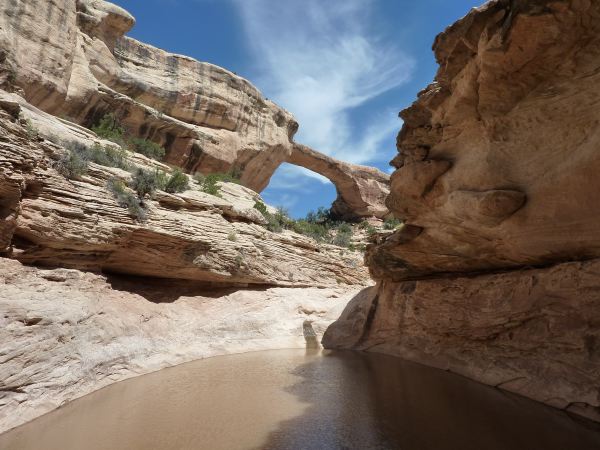 Die „Natural Bridges“ im gleichnamigen „National Monument“ haben uns gelockt, und da wir ja gleich immer alles wollen, haben wir den Trail zu den drei durch Wasser erodierten Steinbrücken mal locker kombiniert und so „Sipapu Bridge“, „Kachina Bridge“ und „Owachomo“ gesichtet. Auf dem Papier sieht alles so einfach aus. Doch nun...unser Schweiß tropft über Stock und über Stein in den weichen Sand hinein...und immer länger zieht sich der erbarmungslose Weg dahin, die Luft steht, Georg vor mir sehe ich nur noch unscharf flirrend dahinstapfen. Fünf Liter Wasserproviant sind schon aufgebraucht, die Sandwiches verzehrt und gerade als ich denke „ich kann nicht mehr denken, nicht mehr laufen, nicht mehr sprechen und sowieso überhaupt nichts mehr“ schaffen wir es gerade noch so zum Parkplatz zurück, meine Beine gehen selbstständig, der Kopf ist überhitzt und hat sich abgemeldet, nur der rettende Anblick unseres wunderbaren Autos erleichtert mich, ein Ruck geht durch mein abgeschaltenes, weich gekochtes Gehirn, denn endlich safe, gerettet, in Sicherheit. Heureka! Weiter hätte es nicht sein dürfen – gerade mal noch so geschafft! Kreidebleich, entkräftet, entwässert und entsalzt schleppe ich mich die letzten Meter und ziehe mich den Beifahrersitz hoch, in den rettenden Schatten des Autos.Danach gibt´s nur drei Dinge zu tun, Grundbedürfnisse stillen: