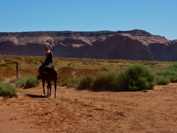 „Pinch Trail Rides, Navajo-owned, Horsebackriding for experienced and beginners" ist in bunten Farben draufgemalt. Ich juchze auf! Ja, ja, reiten, auf jeden Fall! „Schatz, egal jetzt, ob Morla-Turtle oder Marlboro-Camel-Fels. FAHR-DA-REIN! Ich springe nahezu den irritierten Pferden entgegen. Nach kurzen Verhandlungen mit einem John-Wayne-Look-Alike (war das nicht in Navajo-Hand hier?, bin verwirrt, aber egal), steht bald fest: sofern ich versprechen kann, während den zwei Stunden nicht den roten Sand zu küssen, kann ich galoppieren! Aber Hallo! Die Pferde sind flugs aufgetrenst, ich noch schneller im Sattel und wir reiten den malerischen karmesinroten Felsen entgegen. Nuvju hat meine Bitte direkt richtig verstanden, wir galoppieren mit „Whitesock“ (sein Pferd) und „Guiness“ (meins), was das Zaumzeug hält!