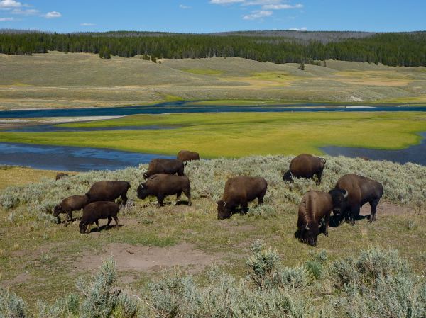Weiter geht unsere Fahrt am dunkelblauen „Yellowstone Lake“ entlang zur „Fishing Bridge“, wo wir Pelikane beobachten und eine Elchfamilie in den angrenzenden dampfenden Wiesen liegt, hoch zum „Hayden Valley“. Dort kündigt eine Autokolonne schon an: „Hier gibt’s was zu sehen“ - und tatsächlich! Es ist wie in den „Cowboy- und Indianer“-Filmen: im idyllischen, endlos weiten, moosgrünen Tal weiden Hunderte von Büffeln in orange-rotem Licht, ein kobaltblauer Fluß schlängelt sich gleichmäßig sanft durch das Valley, die Bisons schreiten majestätisch und dampfend hindurch, wandern den camouflagefarbenen Berg hoch, wirbeln mit ihren Hufen hellen Staub auf, unzählige Kälber grasen zwischen den massiven Muttertieren, Einige liegen entspannt dösend am Boden.